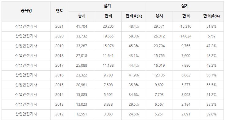 필기시험은 꾸준한 상승세를 보이며 40% 이상의 합격률을 보입니다.